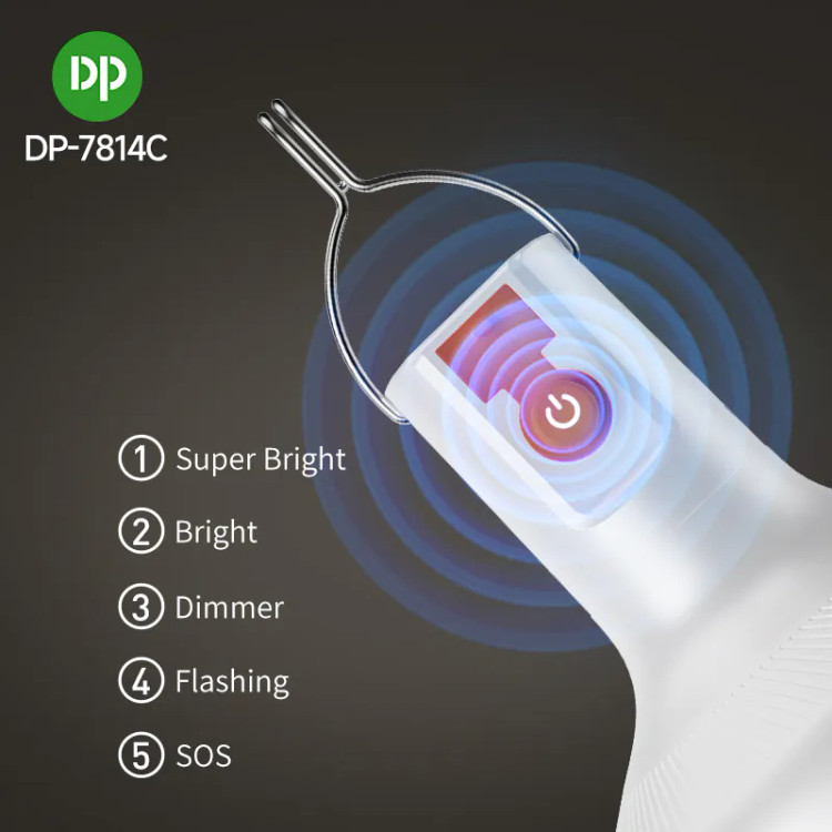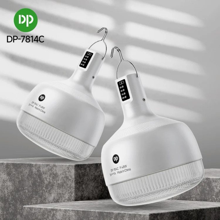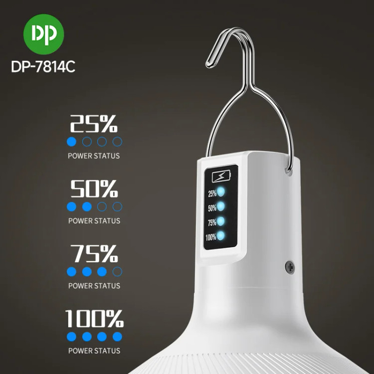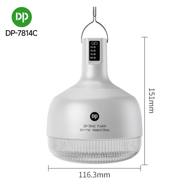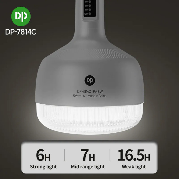 لامپ LED شارژی آویزدار دی پی مدل DP-۷۸۱۴C توان خروجی ۴۸ وات را دارد و با وزن سبک اما باتری داخلی ۱۸۶۵۰ به ظرفیت ۶۰۰۰ میلی آمپر بهترین گزینه برای کمپینگ، طبیعت گردی، مسافرت و ... می باشد، همچنین دارای پنج حالت نوردهی که شامل نور ثابت قوی/ متوسط/ ضعیف/ چشمک زن/ SOS با رنگ نوردهی مهتابی است که برحسب سلیقه و کاربری قابل انتخاب می باشد.