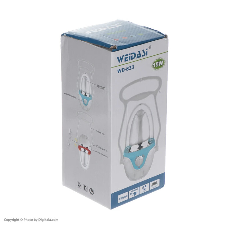 تقریبا در قسمت داخلی سقف همهی چادرها، یک حلقه یا بند وجود دارد که برای آویزان کردن چراغ در نظر گرفته شده است. چراغ چراغ فانوسی ویداسی مدل WD-833 کد 01طراحی مناسبی دارد و میتواند در سفرهای ماجراجویی، به خوبی روشنایی داخل چادر و همچنین در محیط را برایتان به همراه بیاورد. مهمترین ویژگی این محصول تعبیه پورت خروجی mini USB charge با قابلیت پاوربانک میباشد تا علاوه بر روشنایی بتوان برای شارژ انواع تلفن همراه و دستگاه های دیگر نیز از آن استفاده نمود و همچنین سیاری از چراغ قوهها به دلیل وزن بالا و نداشتن حلقه یا قلاب، برای این کار مناسب نیستند یا حتی در صورت داشتن این موارد، نور را بهخوبی در چادر پخش نکرده و بیشتر در یک نقطه متمرکز میکنند. در این وضعیت، محصولی مانند چراغقوهی آویز چادر بسیار کارآمد است. این چراغ قوه حدود 450 گرم وزن دارد که به ستونهای چادر فشاری وارد نمیآورد؛ همچنین میتوان بهسادگی آن را زمان سفر با خود حمل کرد. در قسمت بالایی این محصول، یک قلاب پلاستیکی تعبیه شده است تا به سادگی داخل چادر آویزان شود. نور این محصول به دلیل حالتی که قسمت پایینی خودش دارد، بهخوبی مانند یک لامپ داخل چادر را روشن میکند و در یک نقطه متمرکز نمیشود. برای خاموش و روشنکردن این چراغ قوه، یک کلیدی در نظر گرفته شده است که در دو وضعیت کم نور و پرنور کار میکند. در برنامههای گذران شب در طبیعت، برای دیدن محیط اطراف از طریق چراغ قوه یا آتش روشنایی ایجاد میکنند که هیچکدام از این روشها برای بهتردیدن محیط داخلی چادر مناسب نیستند.