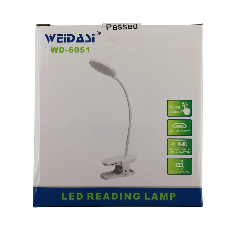 این محصول یکی از جدیدترین تولیدات کمپانی ویداسی (WEDASI) است. این چراغ مطالعه گیره دار بوده که می توان به هر جای ممکن مانند میز کار متصل کرد. بدنه ی آن قابل انعطاف بوده و می توان به راحتی آن را خم کرد و در مکان مورد نظر قرار داد. لامپ آن از نوع SMD می باشد (18 عدد SMD) و دارای نوردهی مطلوب، مصرف پایین و عمر بالا می باشد. یک باطری قابل شاژ در داخل پایه چراغ قرار دارد که شما را از برق مستقیم شهر بی نیاز می کند. و در مواقعی که برق قطع است شما می توانید به راحتی به مطالعه و انجام کارهای خود ادامه دهید. این چراغ مطالعه دارای یک دکمه لمسی می باشد که توسط آن می توان نور لامپ را به میزان دلخواه تنظیم کرد به این صورت که با لمس این دکمه و نگه داشتن انگشت روی آن نور لامپ کاهش یافته و با لمس مجدد آن نور لامپ افزایش می یابد (دیمر لمسی). از مزیت این چراغ مطالعه علاوه بر کم مصرف بودن آن، طراحی زیبا و وزن کم آن می باشد. که به راحتی می توان آن را با خود حمل کرد.